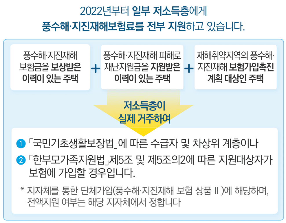 행안부가 주관하는 정부 지원정책으로 저렴한 보험료로 예상치 못한 풍수해(태풍, 홍수, 호우, 해일, 강풍, 풍랑, 대설, 지진)에 대한 대처를 할 수 있도록 보험료를 지원해주는 정부정책입니다.