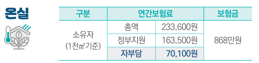●온실의 경우 연간보험금 24만원, 자부담 7만원이며 보상지급보험금금액은 870만원입니다.
