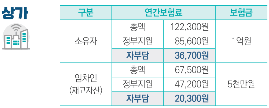 ●상가의 경우 연간보험금 123000원, 자부담 36000원이며 보상지급보험금액은 1억원입니다.