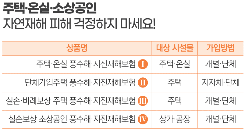 풍수해지진재해 보험에는 크게 4가지 상품으로 주택온실/ 단체가입주택/ 실손비례보상주택/ 실손보상 소상공인 보험으로 나뉘게 됩니다.