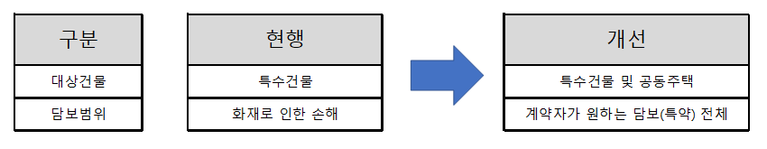 제도 도입 이후 화재발생 이력 등으로 보험가입이 어려운 공동주택*도 특수건물처럼 공동인수제도를 활용하여 보험에 가입하도록 하고, 화재로 인한 손해로 한정되어 있는 담보범위를 건물붕괴 등 화재 외 손해도 포함할 수 있도록 확대할 필요성이 제기되었습니다.