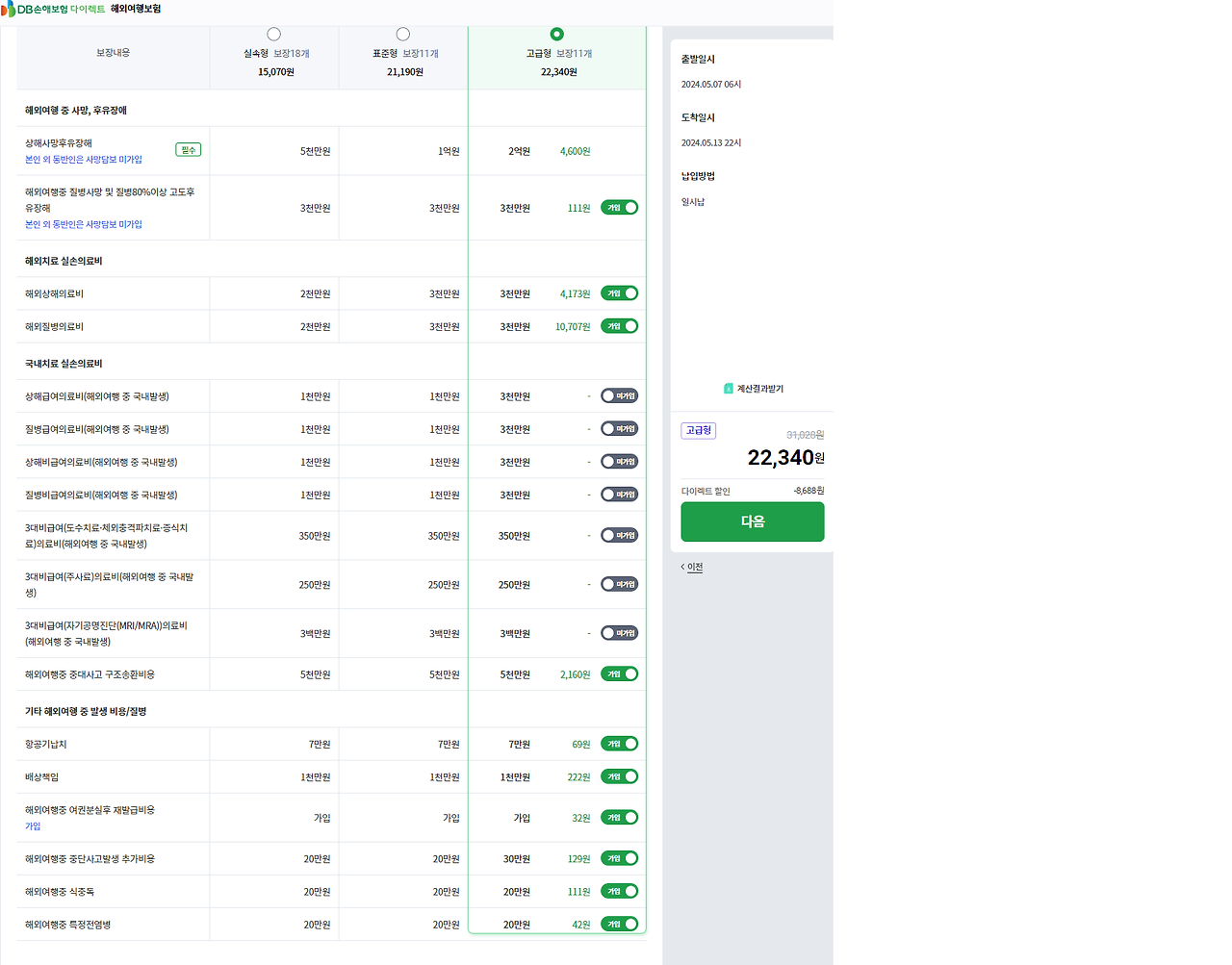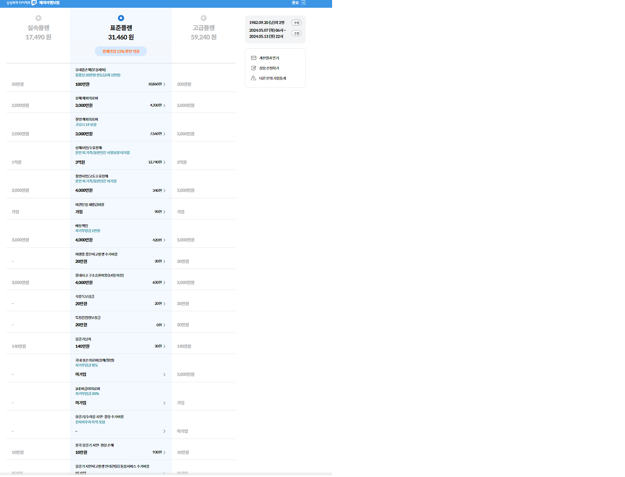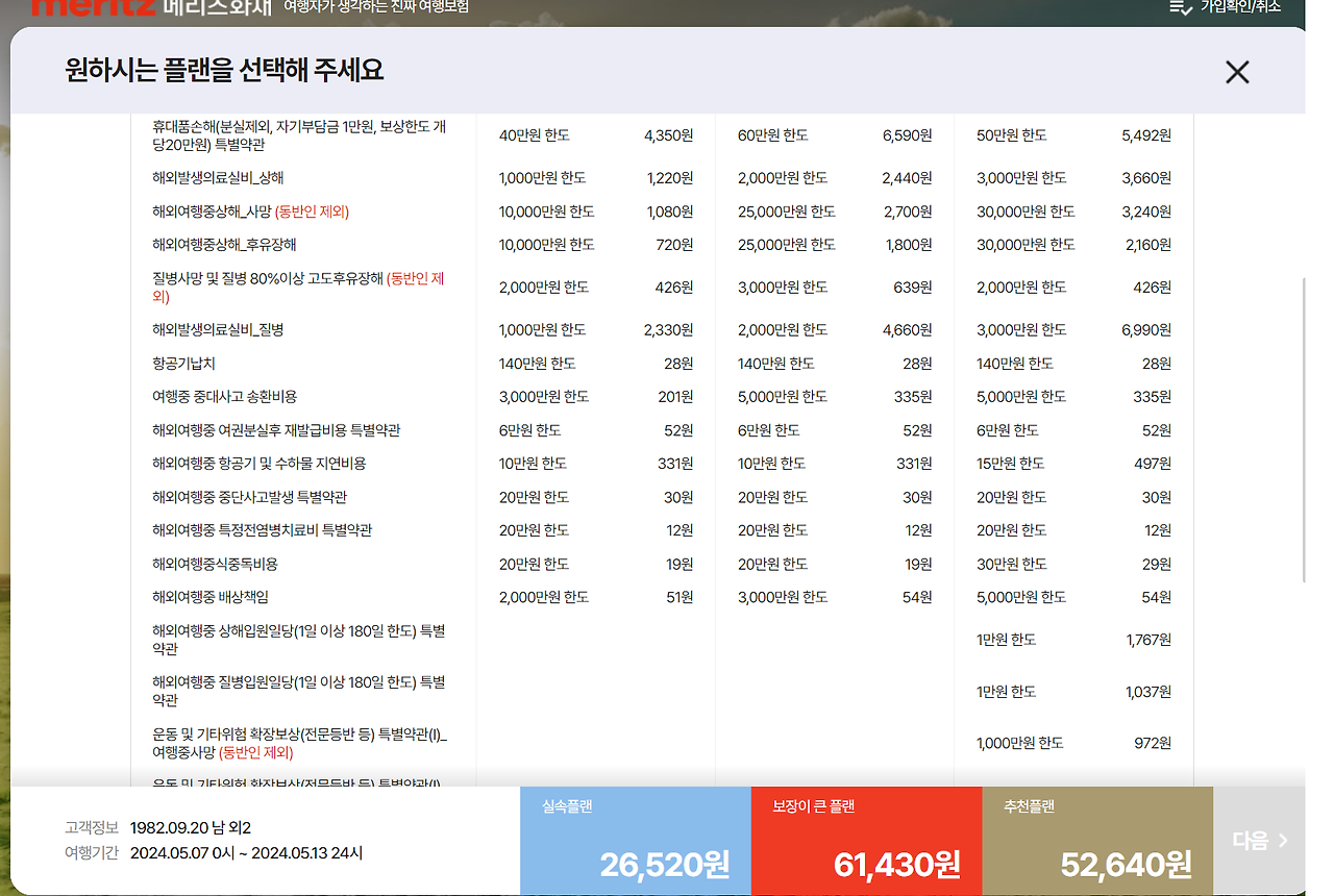 고급형으로 사망보험금은 2억원이고 다른 보상 한도는 3천만 원입니다. 이 부분은 다른 보험사들도 비슷하게 3천만 원입니다. 그리고 저는 실손 보험이 있기 때문에 국내치료 실손 의료비는 미가입으로 조회했습니다.