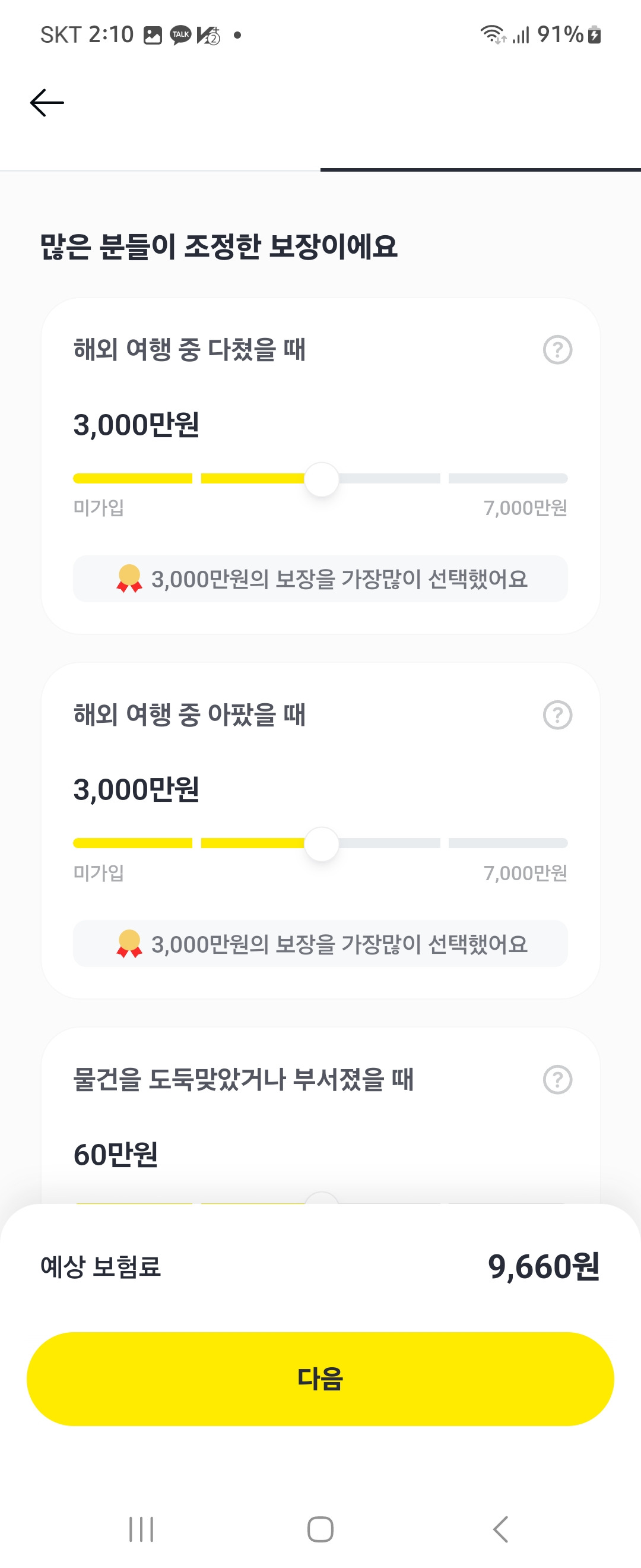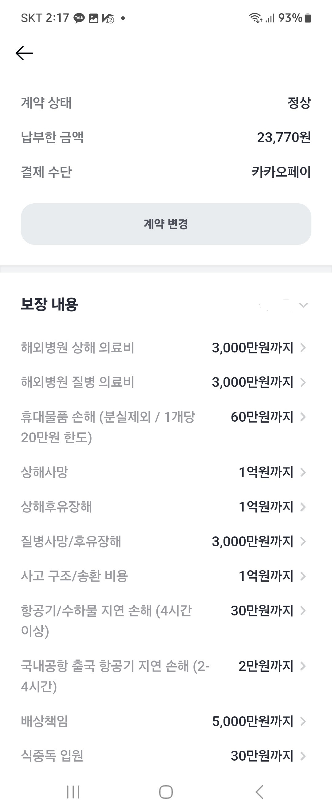 마지막으로 카카오 여행보험입니다. 카카오 보험은 한도 금액을 보험가입자가 원하는 한도로 설정할수 있게 되어 있습니다. 저는 상해, 질병을 3천만 원으로 설정하고 휴대품 분실을 한도 60만 원으로 설정했습니다.